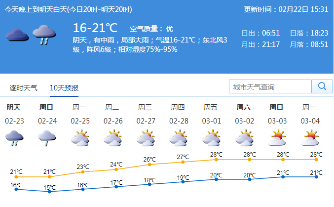 市氣象局預(yù)計,23-24日,深圳市有中雨局部大雨,可能伴有雷暴,降雨時段主要出現(xiàn)在23日白天到24日上午,沿海和高地有7級偏東陣風;23日氣溫在16-21℃;東北風3級;相對濕度75%-95%;25日起多云可見陽光,天氣溫暖。