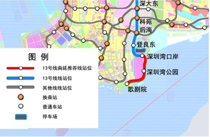 13號(hào)線南延線將服務(wù)規(guī)劃十大重要文體設(shè)施—深圳市歌劇院,并提高深圳灣公園的軌道服務(wù)水平。線路由深圳灣口岸站站后引出,出站后沿望海路東側(cè)向南敷設(shè),上跨東濱路隧道后于深圳灣公園婚慶公園停車場(chǎng)設(shè)深圳灣公園站;出站后線路向西南方向敷設(shè),與望海路交叉兩次后沿望海路南側(cè)深圳灣公園運(yùn)動(dòng)公園向西敷設(shè),再次下穿望海路后沿望海路西側(cè)敷設(shè),終止于后海大道東北側(cè),設(shè)歌劇院站。