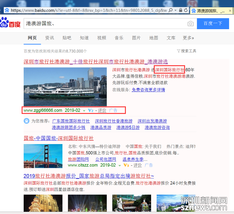 深圳市消委會(huì)模擬消費(fèi)者網(wǎng)絡(luò)搜索實(shí)際使用場(chǎng)景,在百度搜索中搜索“港澳游國(guó)旅”等關(guān)鍵詞,進(jìn)行了專項(xiàng)測(cè)試調(diào)查。調(diào)查發(fā)現(xiàn),搜素“港澳游國(guó)旅”等關(guān)鍵詞時(shí)搜索頁(yè)面會(huì)出現(xiàn)加V等級(jí)認(rèn)證的旅行社廣告信息,但經(jīng)核實(shí),“深圳信用網(wǎng)”商事主體登記信息中并無該企業(yè)。