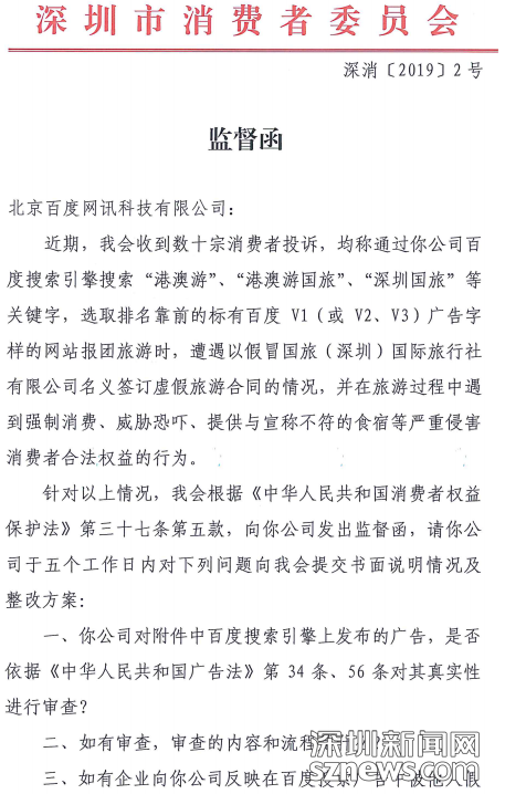 2月26日上午,深圳市消費(fèi)者委員會(huì)(以下簡(jiǎn)稱“深圳市消委會(huì)”)就春節(jié)期間,不少外地消費(fèi)者通過百度搜索廣告報(bào)名港澳游“野馬”旅行社上當(dāng)被騙的問題,召開港澳游“野馬”旅行社投訴調(diào)查情況通報(bào)會(huì),通報(bào)投訴調(diào)查進(jìn)展情況。