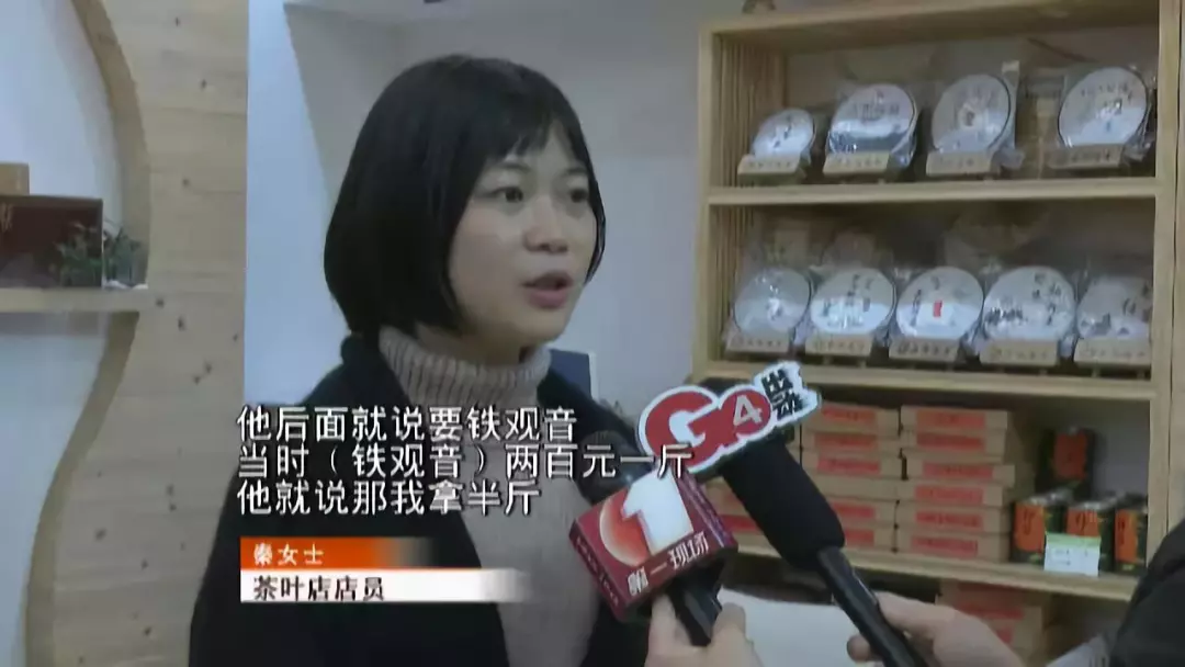 秦女士介紹,26日下午5點鐘左右,她和另一位店員正在包裝茶葉。正當(dāng)兩人忙活的時候,一位目測有40多歲的顧客突然進店,說想要買點茶葉。秦女士回憶,那個人一進來就問了有沒有一百塊的茶葉,她說沒有,然后這位顧客就問最便宜的茶是哪一種,最后說要買鐵觀音,而鐵觀音是200塊一斤,顧客表示要半斤。