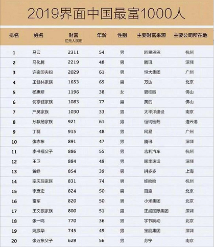 界面發(fā)布2019中國(guó)最富1000人榜:馬云問(wèn)鼎中國(guó)首富馬化騰緊隨其后