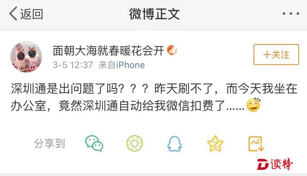 據(jù)微博網(wǎng)友“@面朝大海就春暖花會(huì)開(kāi)”反映,3月5日中午,自己坐在辦公室還被“深圳通+”小程序微信扣費(fèi)。市民何先生也致電本報(bào)說(shuō),“中午12點(diǎn)30分左右,自己坐312公交車(chē),用微信深圳通小程序刷卡,被重復(fù)扣費(fèi)一次,聯(lián)系深圳通公司無(wú)人接聽(tīng)?!?/p>