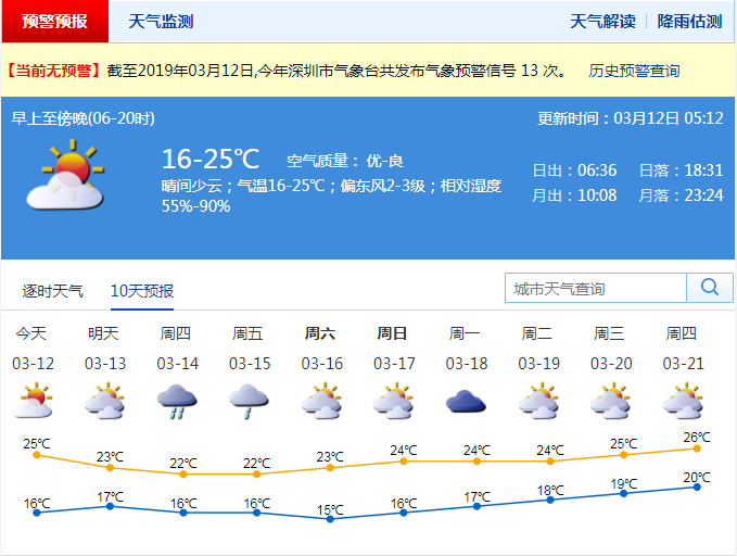 深圳新聞網(wǎng)2019年3月12日訊 今天白天,全市天氣大致晴好,可見陽光,早晚最低氣溫徘徊在16℃左右,中午前后最高氣溫升至25℃左右。天氣晴好,適合洗曬。但晝夜溫差大,注意及時增添衣物。