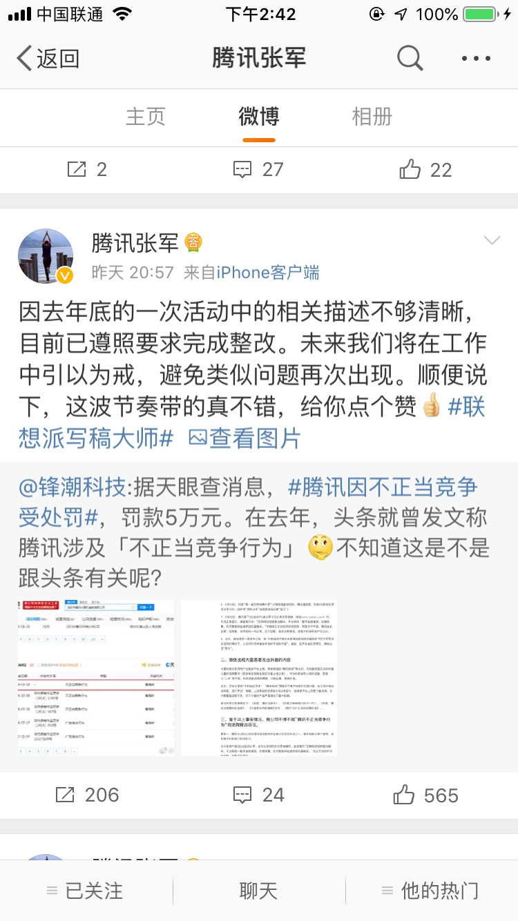數據顯示,騰訊在前兩次受到行政處罰的類型均為不正當競爭。微博賬號 @鋒潮科技發(fā)文稱,去年,今日頭條就曾發(fā)文稱騰訊設計不正當競爭行為,不知道這是不是跟頭條有關。對該揣測,張軍還在微博中調侃工作人員不早公布緣由,導致該事件被人帶節(jié)奏。