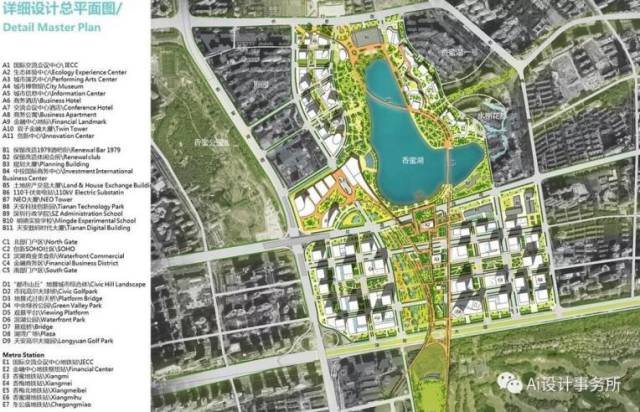 該方案中規(guī)劃了國際交流會議中心、城市演藝中心、城市博物館及雙子金融大廈等,以及地景式過街天橋、中央綠谷公園等。