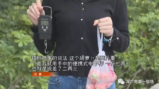記者按照市民提供的線(xiàn)索,在通道上隨機(jī)選了一個(gè)攤位,購(gòu)買(mǎi)了2斤胡蘿卜,可用自帶的便攜秤稱(chēng)重后,發(fā)現(xiàn)缺了二兩。而在另外一個(gè)攤位上,記者買(mǎi)到的茄子也少了近3兩。