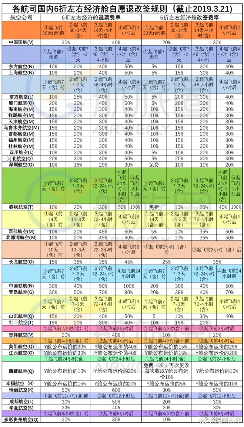 具體每家航司收取多少退改簽手續(xù)費,可以詳見下方表格↓↓↓