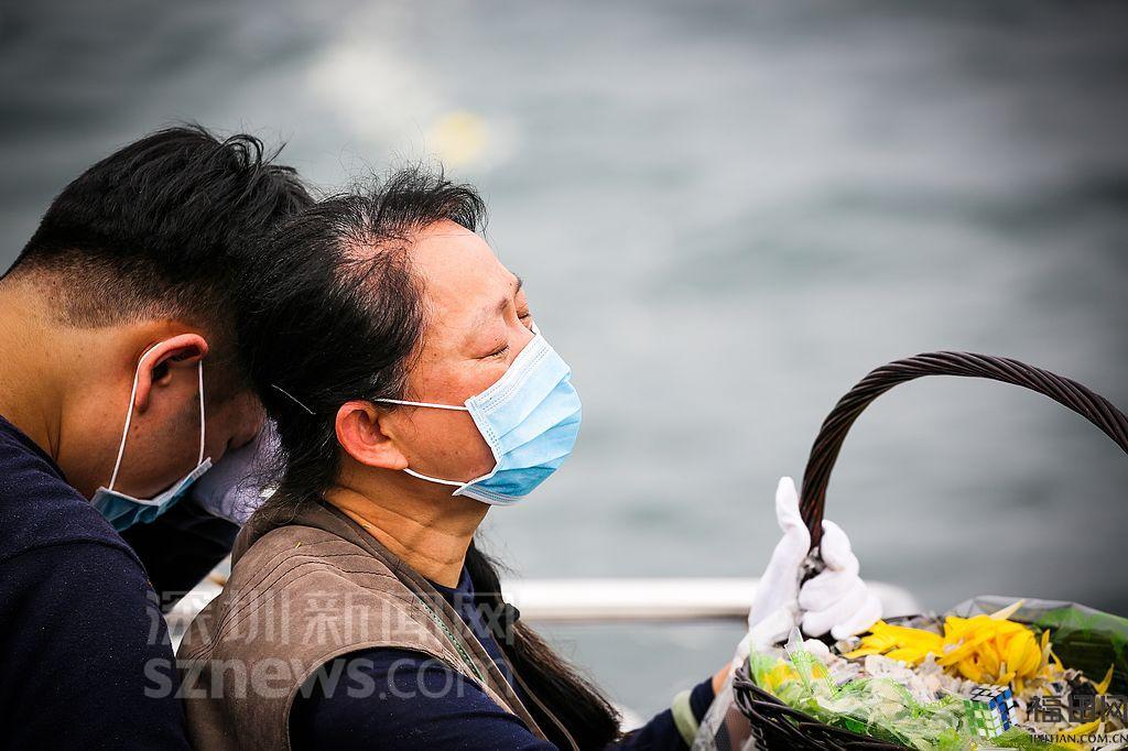 花瓣和骨灰一同撒向大海,家屬為逝者默哀。