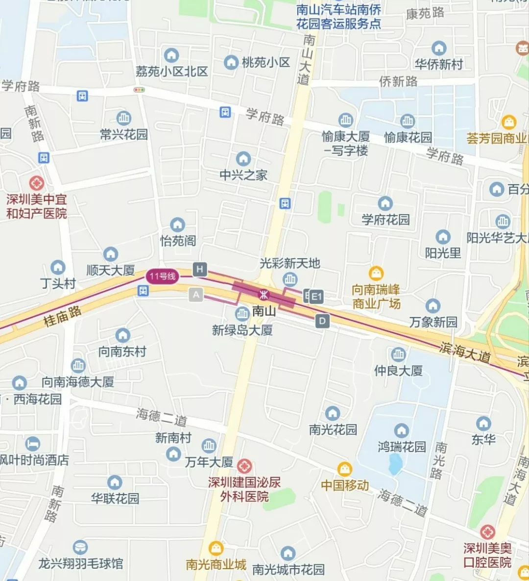 南山站總共有5個出入口,A口位于南山大道南側(cè)、桂廟路西側(cè),需要乘車的市民請從D口、H口、E1口、E2口進(jìn)站乘車。