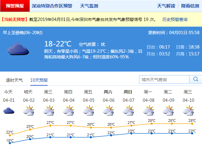 今日深圳陰天,有分散小雨;受冷空氣影響,氣溫下降,天氣稍涼,氣溫18-22℃;偏東風3級,沿海和高地最大陣風7級;相對濕度65%-95%。4月2日至清明假期多云為主,間有陣雨和輕霧,氣溫逐漸回升。