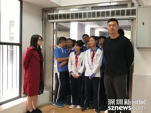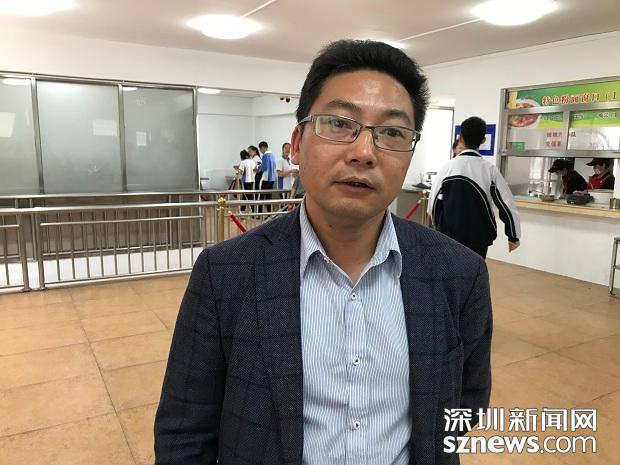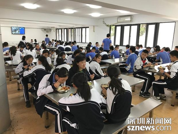 4月1日中午,深圳市福田區(qū)外國(guó)語(yǔ)學(xué)校校長(zhǎng)丁長(zhǎng)義跟學(xué)生一起在食堂就餐