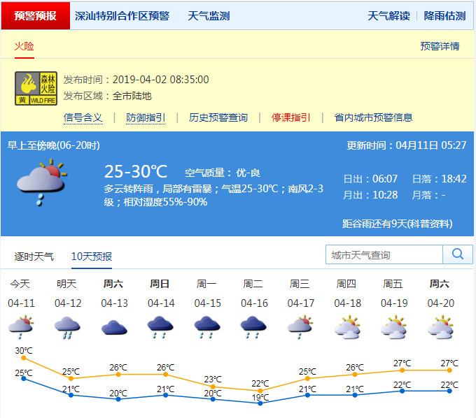 記者從深圳市氣象局了解到,11日深圳天氣多云轉(zhuǎn)陣雨;氣溫在25-30℃;南風(fēng)2-3級(jí);相對(duì)濕度55%-90%。