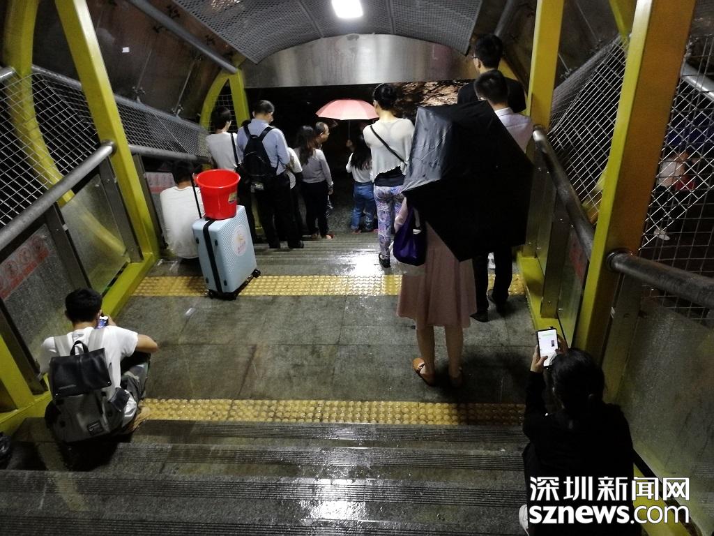 深圳暴雨特效開啟,市民紛紛進入躲雨模式。(記者 邱曉潔 攝于丹竹頭地鐵站
