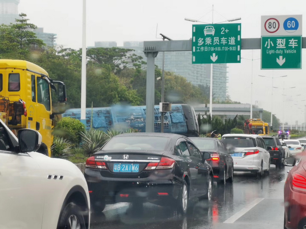 剛剛,濱海大道沙河西路 一大巴車隔離帶上側翻