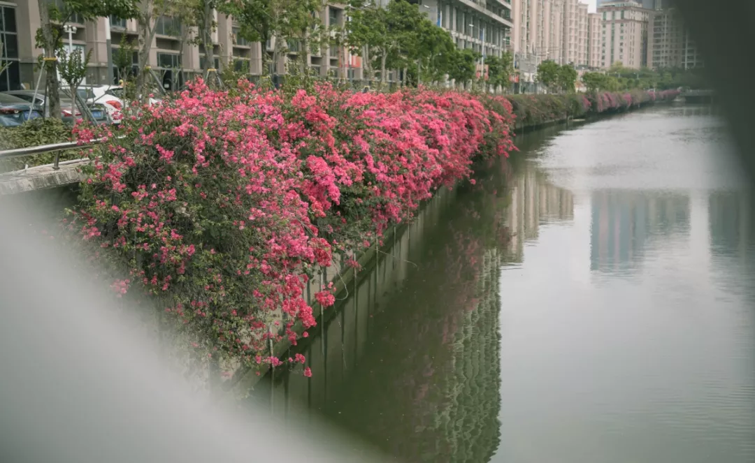 經(jīng)過寶安人不懈的努力,西鄉(xiāng)河已不見了黑臭的身影,此時(shí)盛開的紅色、紫色勒杜鵑清晰地倒映在河面上。