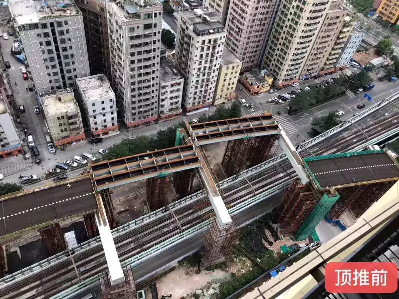 深圳地鐵6號(hào)線一期的紅山站至上塘北站區(qū)間由中鐵建大橋局承建,上跨正在運(yùn)營(yíng)的地鐵4號(hào)線,兩條線最近處僅相隔1.2米。本次頂推高架為4孔30米雙線簡(jiǎn)支鋼混結(jié)合梁,采用依次整體橫向頂推的方式,單孔梁重430噸,最大頂推距離17米,斜跨段平曲線半徑為450米,交叉角達(dá)30度。第一孔簡(jiǎn)支鋼混結(jié)合梁于3月3日開始頂推,歷時(shí)22天,最后一孔于25日完美收工。