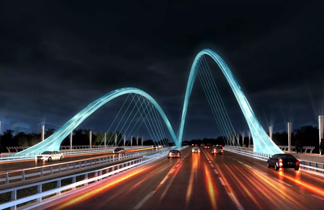 11號(hào)景觀橋以“融合”為主題,將流暢的線條融入景觀橋梁中,兩幅高低拱的線條無(wú)限延伸,猶如行云流水般瀟灑寫(xiě)意,一氣呵成;同時(shí),匯聚為一體的主拱又形成了“門(mén)”的形象符號(hào),迎接著八方來(lái)客。