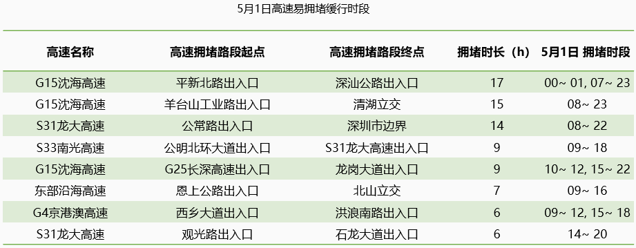 高德地圖交通大數(shù)據(jù)預(yù)測(cè),五一期間深圳出行最容易擁堵緩行的5條高速分別是G15沈海高速、S31龍大高速、S33南光高速、東部沿海高速、G4京港澳高速等高速部分路段。