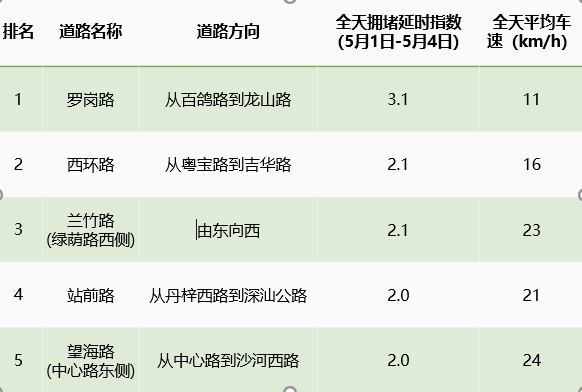 此外,五一期間深圳市內(nèi)易發(fā)生擁堵緩行的路段有羅崗路、西環(huán)路、蘭竹路等。