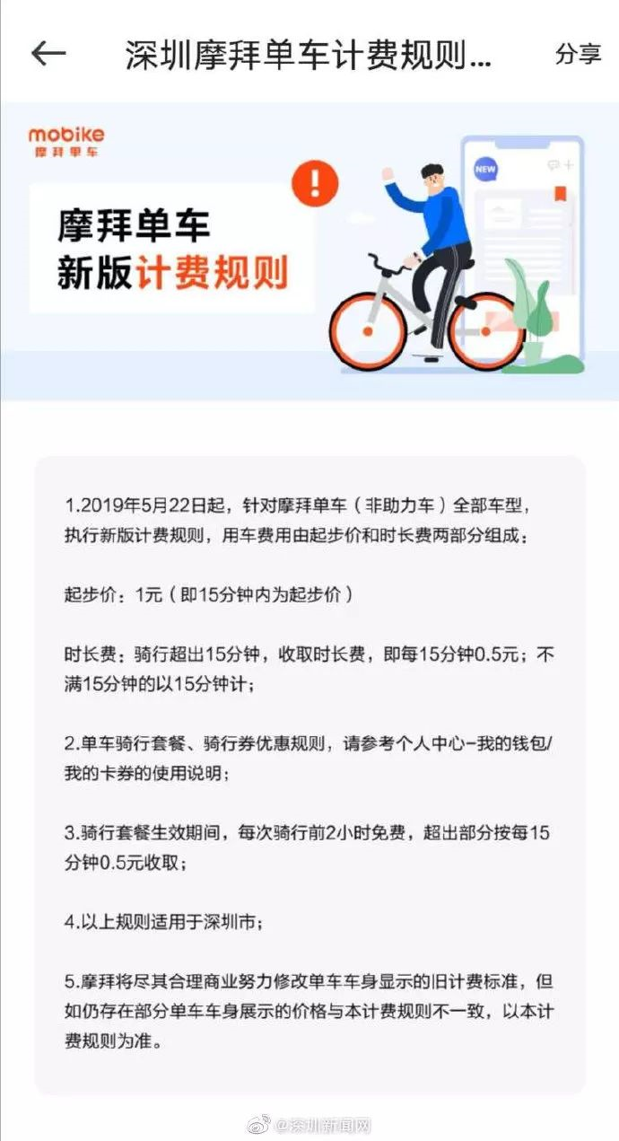 ①摩拜宣布從昨日起在深圳實行新的收費標準。按照新的收費標準,15分鐘以內(nèi)短時騎行用戶基本不受影響,而騎行1小時的費用為2.5元,較目前增加0.5元。