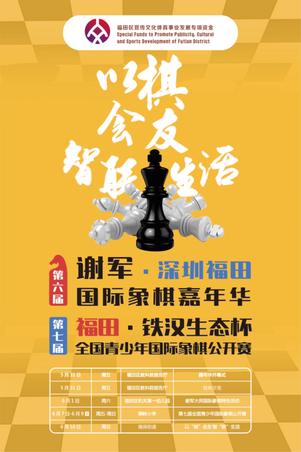 2019年第六屆“謝軍?深圳(福田)國際象棋嘉年華”暨第七屆“福田?鐵漢生態(tài)杯”全國青少年國際象棋公開賽即將于2019年5月31日在福田區(qū)教科院附屬小學(xué)隆重開幕。