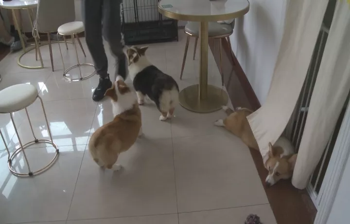 根據(jù)小區(qū)業(yè)主指引,記者來(lái)到小區(qū)13層的一家狗狗咖啡廳,可以看到,門口并沒(méi)有任何招牌,不過(guò)大門打開(kāi)后,可以看到經(jīng)營(yíng)場(chǎng)所有兩層,里面有餐桌凳子,有收銀臺(tái),另外還有四只小型寵物犬。