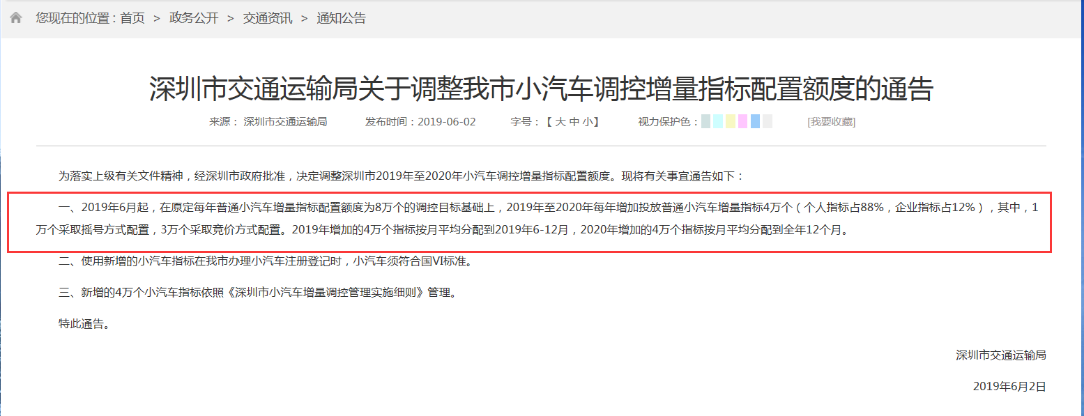 6月2日,深圳市交通運輸局發(fā)布了關(guān)于調(diào)整我市小汽車調(diào)控增量指標(biāo)配置額度的通告