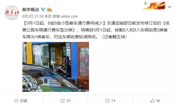 核載8人和9人車輛由原2類客車降為1類客車,降低了對應(yīng)車輛的收費標(biāo)準(zhǔn)