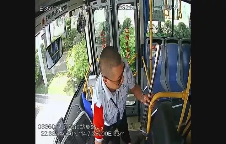 監(jiān)控顯示:6月8日中午12點(diǎn)27分左右,司機(jī)熊師傅正常駕駛車輛,這時(shí)身旁的一名穿黑色上衣的男乘客突然跌倒在地。熊師傅發(fā)現(xiàn)后,急忙將車輛行駛到安全地帶停放,并向男乘客詢問(wèn)情況。