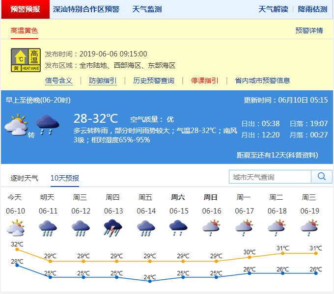 深圳新聞網(wǎng)2019年6月10日訊 在近幾日副熱帶高壓的影響下,深圳迎來了久違的“深圳藍”。不過,市民們在享受通透的藍天夏日的同時,也承受著不斷升溫的“燒烤模式”。2019年6月6日上午09時15分深圳市氣象臺發(fā)布了今年的首個高溫黃色預警信號,2019年6月9日羅湖區(qū)東門自動站記錄到36.2℃高溫。氣溫圖上一片橙色紅色,簡直成了一只“紅燒雞腿”。