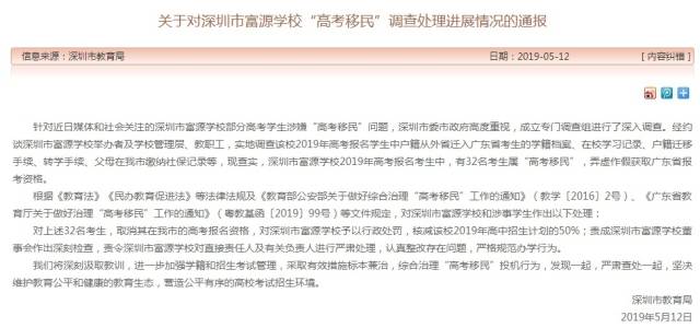 5月12日晚,深圳市教育局發(fā)布《關于對深圳市富源學?!案呖家泼瘛闭{查處理進展情況的通報》,通報稱,經(jīng)查實,深圳市富源學校2019年高考報名考生中,有32名考生屬“高考移民”,弄虛作假獲取廣東省報考資格。按照相關法例,對涉事32名學生取消在深圳市的高考報名資格,對深圳市富源學校予以行政處罰,核減該校2019年高中招生計劃的50%;責成深圳市富源學校董事會作出深刻檢查,責令深圳市富源學校對直接責任人及有關負責人進行嚴肅處理,認真整改存在問題,嚴格規(guī)范辦學行為。