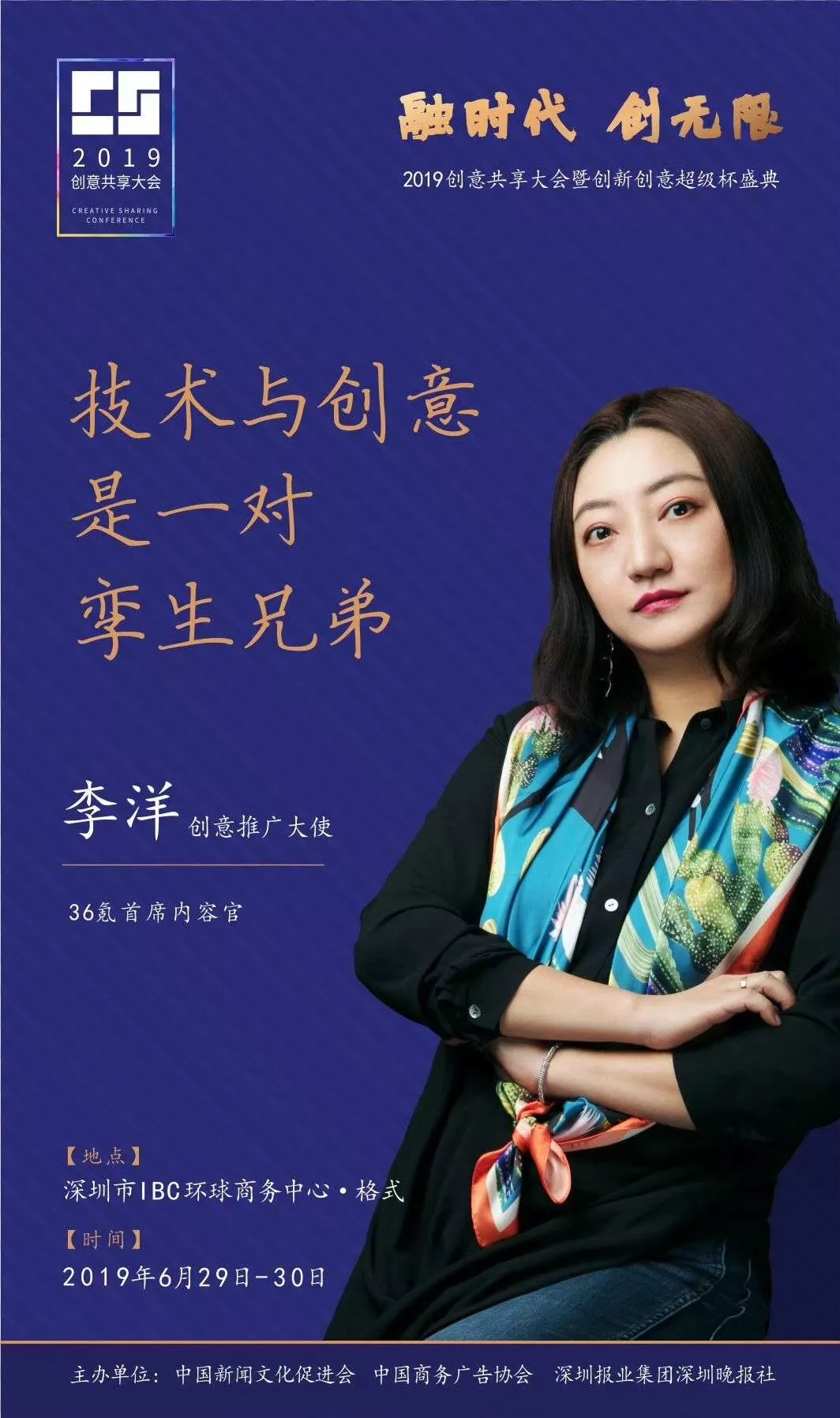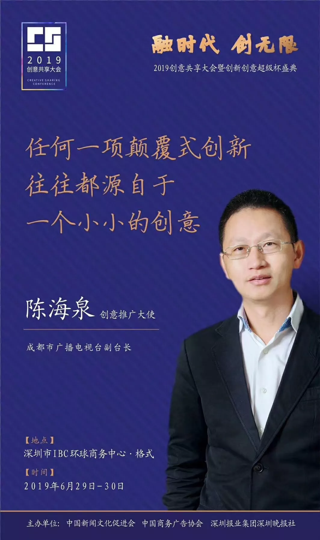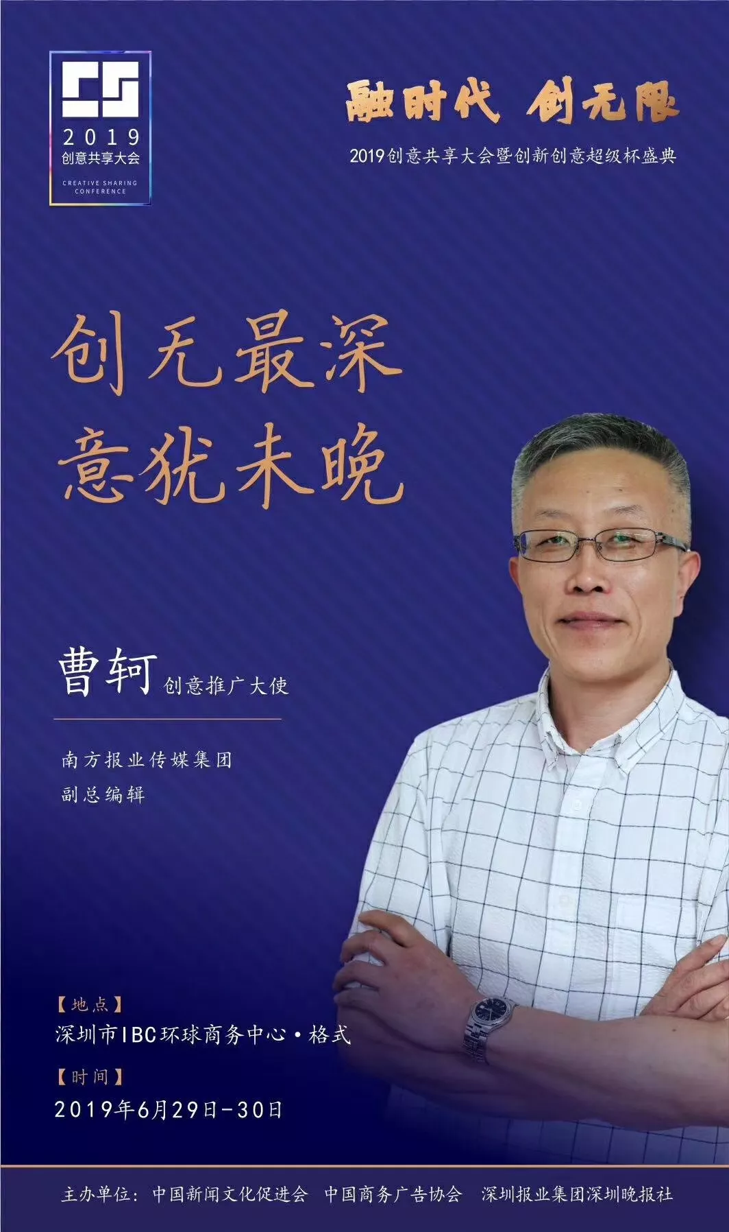 為了展現(xiàn)創(chuàng)意中國的精神風貌和創(chuàng)意傳媒的文化力量,構建創(chuàng)新創(chuàng)意共同體,擘畫美好圖景和未來趨勢,2019年6月29日至30日,由中國新聞文化促進會、中國商務廣告協(xié)會、深圳報業(yè)集團深圳晚報社等聯(lián)合主辦的“融時代創(chuàng)無限——2019創(chuàng)意共享大會暨創(chuàng)新創(chuàng)意超級杯盛典”將在深圳市IBC環(huán)球商務中心隆重舉辦。
