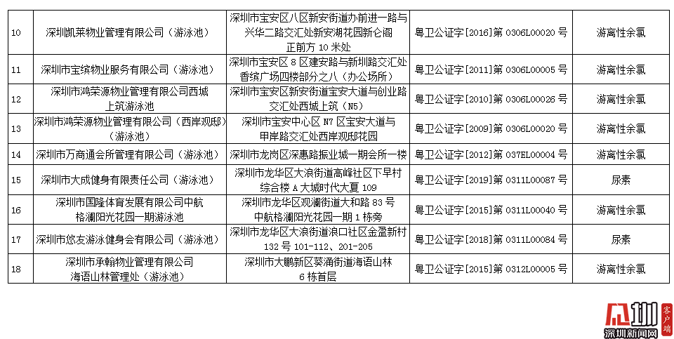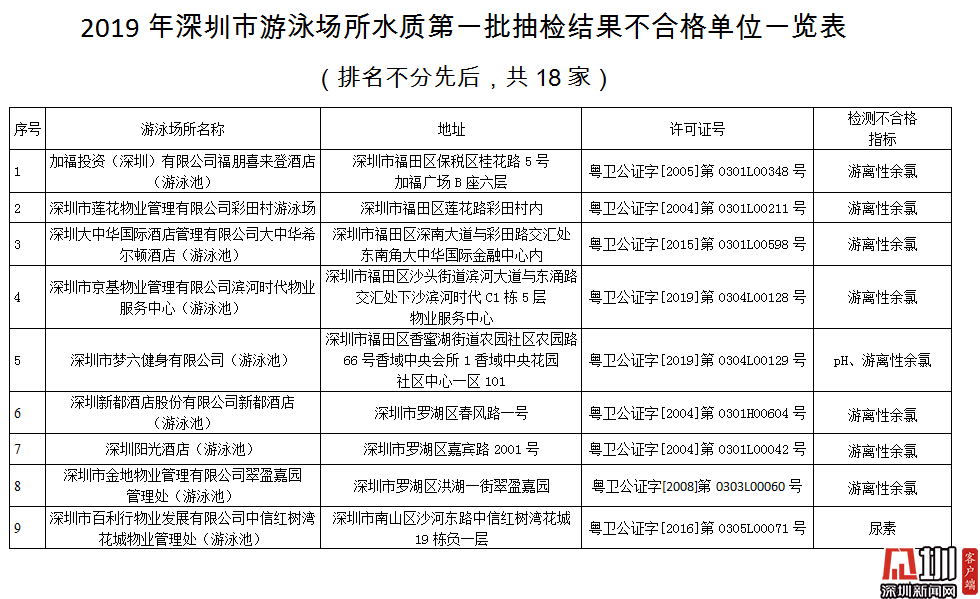 記者獲悉,深圳市夢(mèng)六健身有限公司(游泳池)pH值和游離性余氯指標(biāo)不合格,深圳市百利行物業(yè)發(fā)展有限公司中信紅樹灣花城物業(yè)管理處(游泳池)、深圳市大成健身有限責(zé)任公司(游泳池)、深圳市悠友游泳健身會(huì)有限公司(游泳池)尿素指標(biāo)不合格,加福投資(深圳)有限公司福朋喜來登酒店(游泳池)、深圳市蓮花物業(yè)管理有限公司彩田村游泳場(chǎng)、深圳大中華國(guó)際酒店管理有限公司大中華希爾頓酒店(游泳池)、深圳市京基物業(yè)管理有限公司濱河時(shí)代物業(yè)服務(wù)中心(游泳池)、深圳新都酒店股份有限公司新都酒店(游泳池)、深圳陽光酒店(游泳池)、深圳市金地物業(yè)管理有限公司翠盈嘉園管理處(游泳池)、深圳凱萊物業(yè)管理有限公司(游泳池)、深圳市寶繽物業(yè)服務(wù)有限公司(游泳池)、深圳市鴻榮源物業(yè)管理有限公司西城上筑游泳池、深圳市鴻榮源物業(yè)管理有限公司(西岸觀?。ㄓ斡境兀?、深圳市萬商通會(huì)所管理有限公司(游泳池)、深圳市國(guó)隆體育發(fā)展有限公司中航格瀾陽光花園一期游泳池、深圳市承翰物業(yè)管理有限公司海語山林管理處(游泳池)游離性余氯指標(biāo)不合格。衛(wèi)生監(jiān)督部門已責(zé)令抽檢結(jié)果不合格單位立即整改,并跟蹤整改情況。