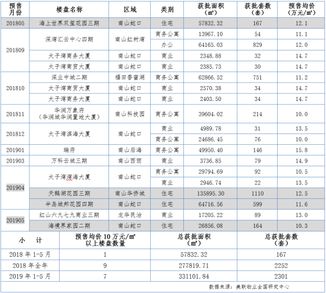 深圳預售均價10萬元/㎡以上的樓盤(2018.1-2019.5)