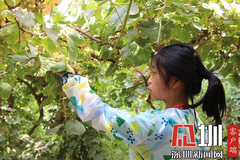 學(xué)生在葡萄溝景區(qū)里摘葡萄。(深圳新聞網(wǎng) 記者吳梓欣 攝)