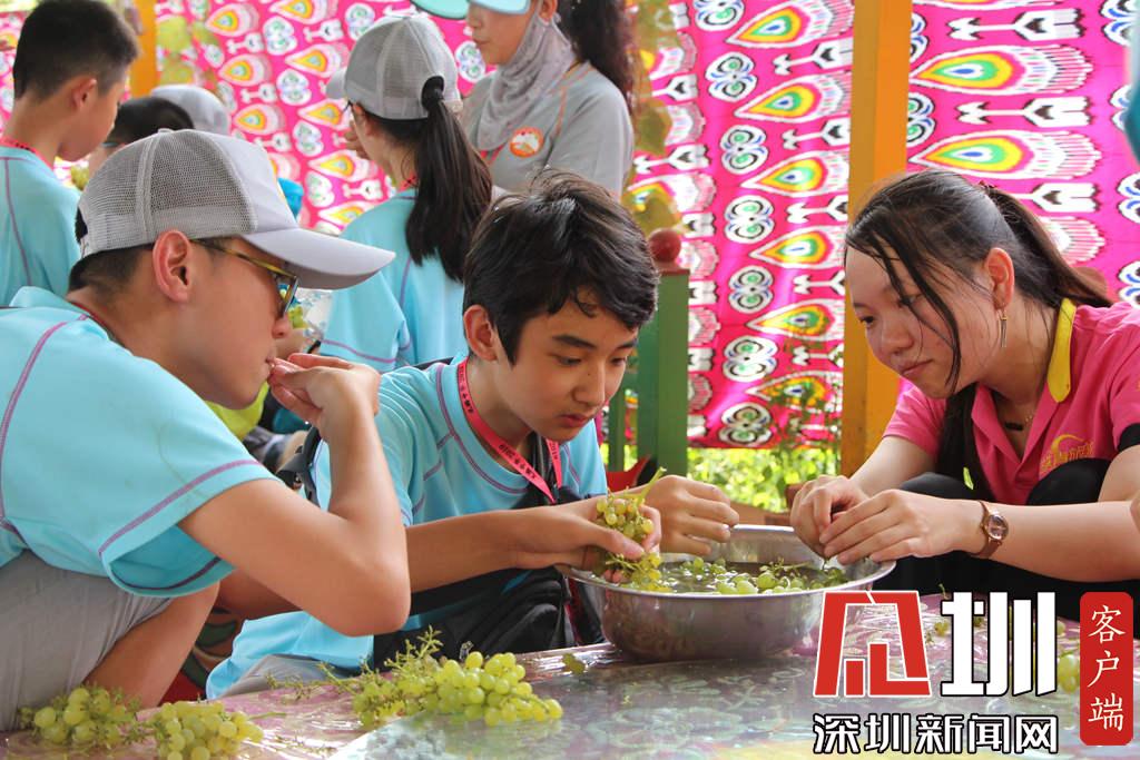 學(xué)生們?cè)谄咸褱暇皡^(qū)里品嘗葡萄。(深圳新聞網(wǎng) 記者吳梓欣 攝)