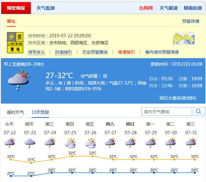 深圳新聞網(wǎng)2019年7月22日訊 炎熱與局地陣雨是近日深圳天氣的主題。據(jù)市氣象局預(yù)計,未來兩天我市依然陽光陣雨相伴,部分時間雨勢較大。其中,22日多云,有(雷)陣雨,局部大雨;27-32℃;西南風(fēng)2-3級;濕度65%-95%。預(yù)計23-24日有(雷)陣雨,局部大雨;25-26日天氣炎熱,有局地短時陣雨。