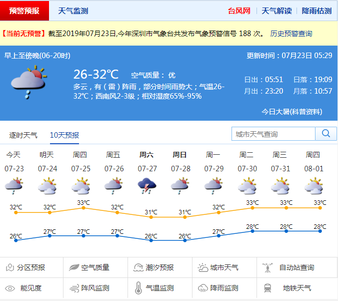 深圳新聞網(wǎng)2019年7月23日訊 市氣象局預(yù)計(jì)深圳23日多云為主,有(雷)陣雨,部分時(shí)間雨勢(shì)較大,局部地區(qū)雨量可達(dá)中到大雨量級(jí);氣溫27-32℃,中午前后體感略顯悶熱;西南風(fēng)2-3級(jí);相對(duì)濕度65%-95%。24-26日轉(zhuǎn)炎熱天氣,午后易激發(fā)熱對(duì)流性降雨,最高氣溫33-35℃;27-28日降雨增多,部分時(shí)間雨勢(shì)較大。