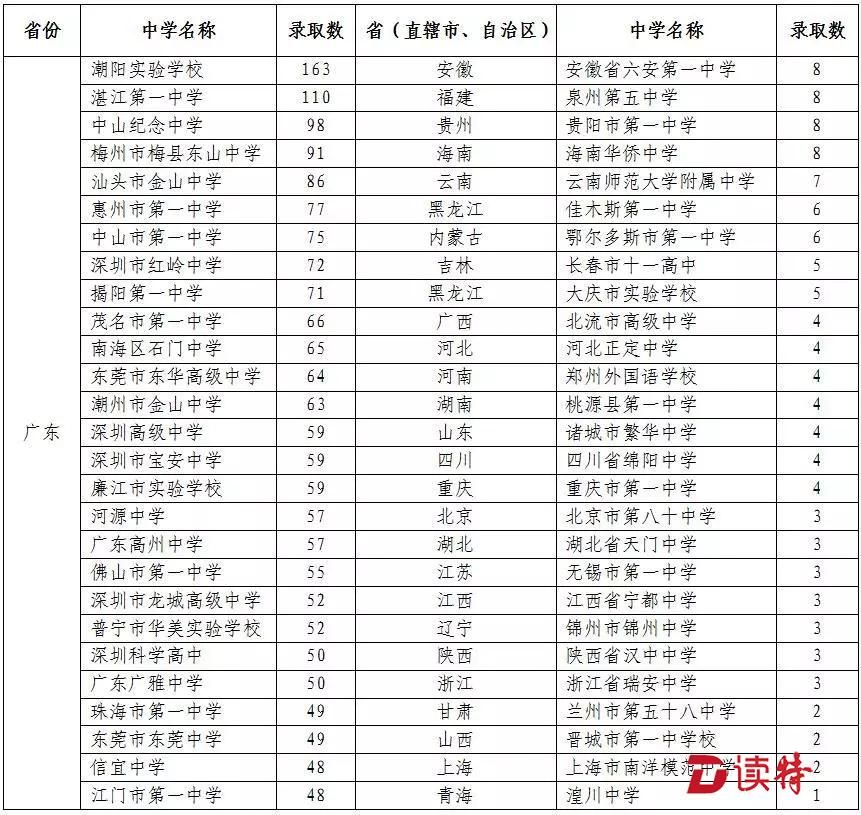 絕大部分考生來自全國知名重點(diǎn)中學(xué)。其中廣東的潮陽實(shí)驗(yàn)學(xué)校錄取人數(shù)最多,達(dá)到163人;湛江第一中學(xué)錄取110人;中山紀(jì)念中學(xué)錄取98人。深圳錄取人數(shù)最多的是紅嶺中學(xué),錄取72人。