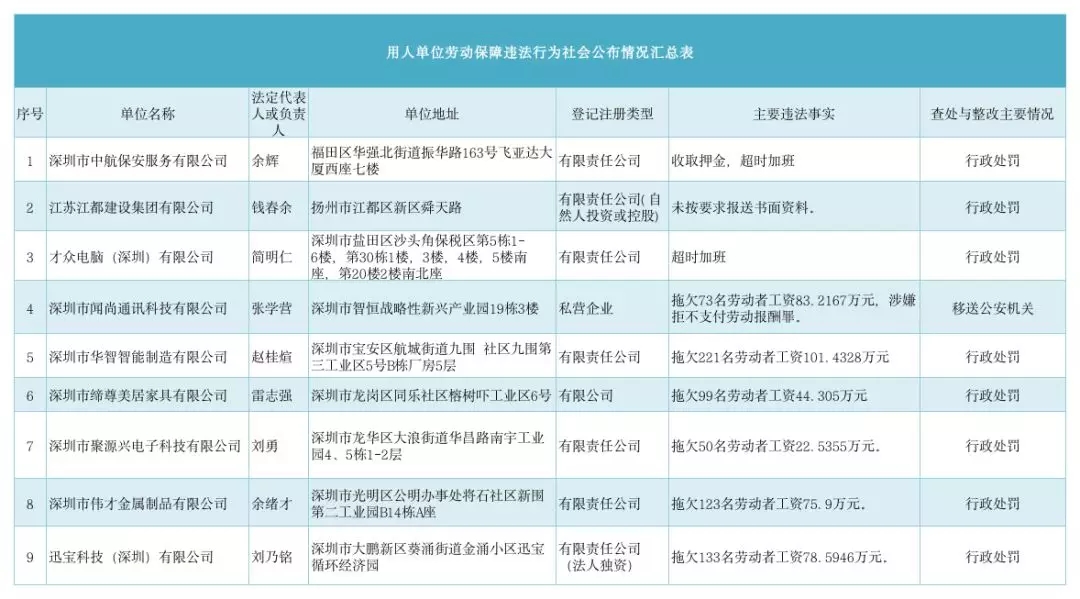 記者了解到,2019年第二季度深圳市人力資源部門繼續(xù)加大對欠薪等勞動(dòng)保障違法行為的打擊力度,依法處罰,對涉嫌犯罪的堅(jiān)決移送司法機(jī)關(guān),切實(shí)維護(hù)勞動(dòng)者的合法權(quán)益。為加強(qiáng)對違法用人單位的社會(huì)監(jiān)督,強(qiáng)化誠信體系建設(shè),加大威懾力,依據(jù)《廣東省用人單位重大勞動(dòng)保障違法行為社會(huì)公布暫行規(guī)定》和《深圳市勞動(dòng)保障違法信息公布辦法》,現(xiàn)將部分區(qū)(新區(qū))人力資源部門查處的一批勞動(dòng)保障違法案件予以公布。