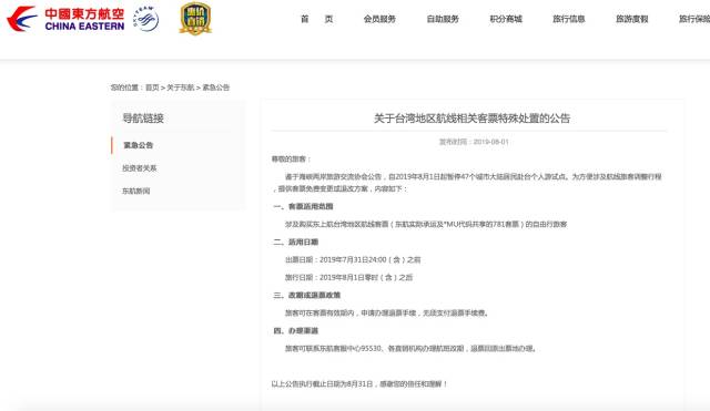 繼深航之后,東航也剛剛發(fā)布了關(guān)于臺(tái)灣地區(qū)航線相關(guān)客票特殊處置的公告:涉及購買東航臺(tái)灣地區(qū)航線客票(東航實(shí)際承運(yùn)及*MU代碼共享的781客票)的自由行旅客,出票日期在2019年7月31日24:00(含)之前,旅行日期在2019年8月1日零時(shí)(含)之后的,旅客可在客票有效期內(nèi),申請(qǐng)辦理退票手續(xù),無須支付退票手續(xù)費(fèi)。