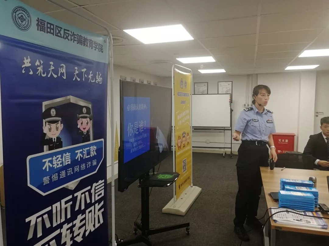 現(xiàn)場(chǎng)由“藍(lán)馬甲”福田反詐騙宣傳專員派發(fā)《福田反詐騙教育學(xué)院??芳靶麄魇謨?cè),讓到場(chǎng)人員初步建立反詐騙知識(shí)體系。本次課程由深圳市公安局福田分局反詐民警講師劉寧警官進(jìn)行授課,她通過(guò)三方面進(jìn)行系統(tǒng)授課:首先,先揭開(kāi)電詐的面具,令人們了解何為電詐;隨后,講解如何防范電詐,“知己知彼,百戰(zhàn)不殆”,通過(guò)對(duì)二百七十多種電詐類型的詳細(xì)解析,提高人們?cè)谌粘I钪械木瑁蛔詈?,愿警民合力結(jié)成反詐的聯(lián)系,維護(hù)社會(huì)和諧治安。