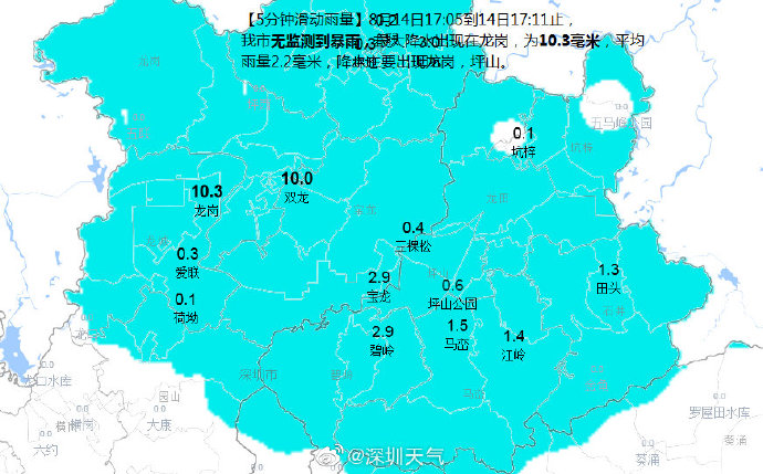 預(yù)計(jì)坪山區(qū)和龍崗區(qū)(坪地、寶龍、龍崗、龍城街道)1小時(shí)內(nèi)將出現(xiàn)30毫米左右降水,深圳市氣象臺于2019年08月14日17時(shí)05分在坪山區(qū)和龍崗區(qū)(坪地、寶龍、龍崗、龍城街道)發(fā)布暴雨黃色分區(qū)預(yù)警,全市進(jìn)入暴雨戒備狀態(tài),請注意防范。