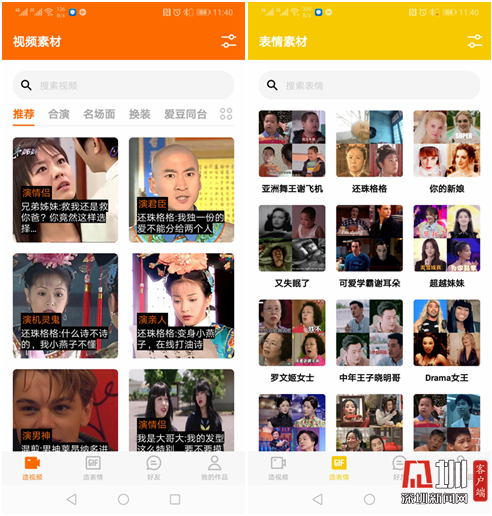 ZAO提供的視頻素材和表情素材頁面截圖。