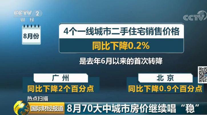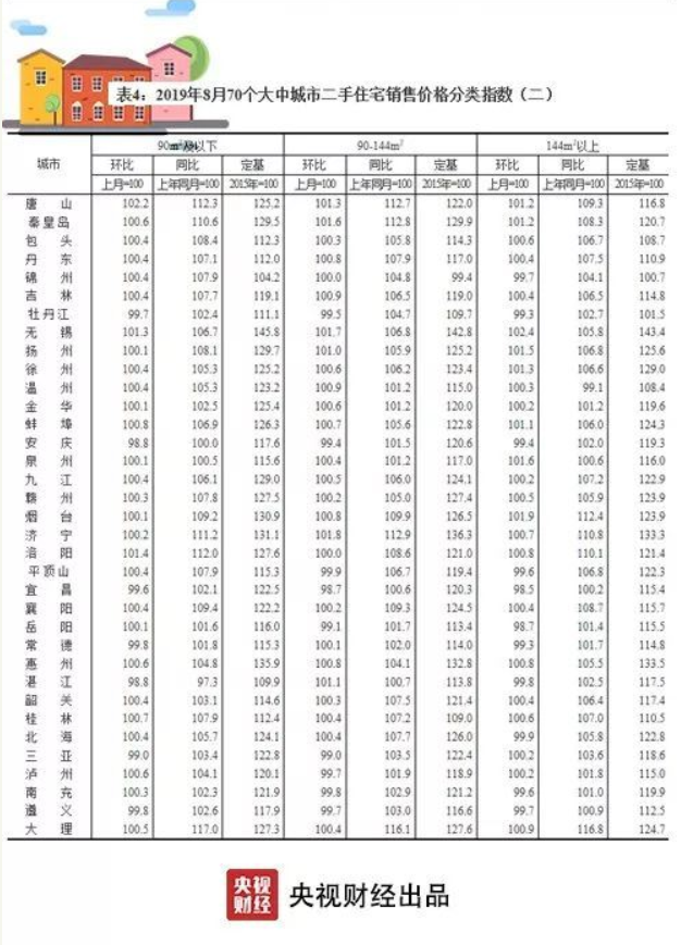 央視財(cái)經(jīng)2019年9月18日訊 近日,國(guó)家統(tǒng)計(jì)局發(fā)布了8月份70個(gè)大中城市商品住宅銷(xiāo)售價(jià)格變動(dòng)情況:一二線(xiàn)城市新建商品住宅和二手住宅銷(xiāo)售價(jià)格環(huán)比、同比漲幅均與上月相同或回落;三線(xiàn)城市新建商品住宅銷(xiāo)售價(jià)格環(huán)比漲幅與上月相同,二手住宅漲幅微升。