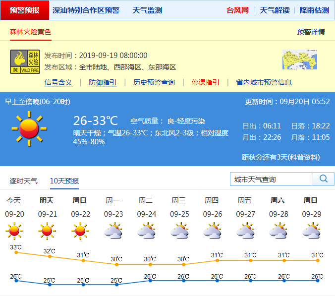 見圳客戶端·深圳新聞網(wǎng)2019年9月20日訊 深圳市氣象局預(yù)計(jì)氣溫26-33℃;東北風(fēng)2-3級(jí);相對(duì)濕度50%-80%。 21-22日持續(xù)晴天干燥;23-26日以多云為主。