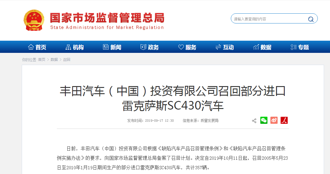 日前,豐田汽車(中國)投資有限公司根據(jù)《缺陷汽車產(chǎn)品召回管理?xiàng)l例》和《缺陷汽車產(chǎn)品召回管理?xiàng)l例實(shí)施辦法》的要求,向國家市場監(jiān)督管理總局備案了召回計(jì)劃。決定自2019年10月11日起,召回2005年5月23日至2010年1月19日期間生產(chǎn)的部分進(jìn)口雷克薩斯SC430汽車,共計(jì)357輛。
