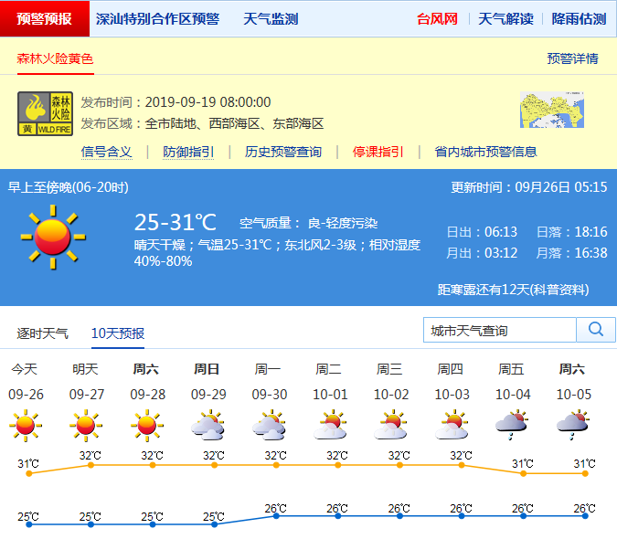 由于近期大氣層結(jié)靜穩(wěn),深圳持續(xù)受偏北下沉氣流控制,近地面風(fēng)力微弱且中西部地區(qū)出現(xiàn)局地風(fēng)向輻合,氣象條件不利于污染物擴(kuò)散,25日下午中西部地區(qū)出現(xiàn)了輕微到輕度灰霾;預(yù)計(jì)入夜后,能見(jiàn)度將逐漸好轉(zhuǎn)。26-30日深圳晴天到多云為主,空氣干燥。26日氣溫25-31℃,陽(yáng)光充足;展望10月初晴朗干燥天氣持續(xù)。森林火險(xiǎn)預(yù)警持續(xù)生效中。