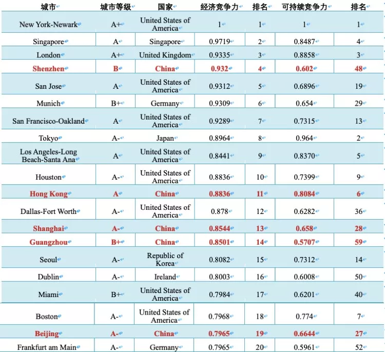 全球城市經(jīng)濟競爭力指數(shù)前二十強